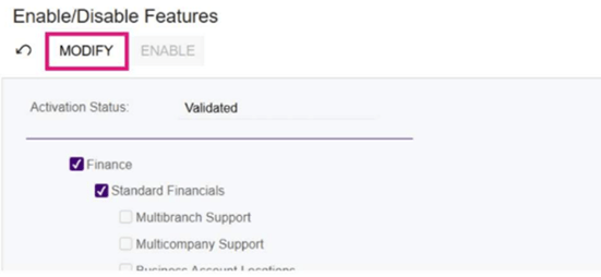 Step 2: Activate the feature. Select Modify to make the feature checkboxes editable within the Enable/Disable Features screen.