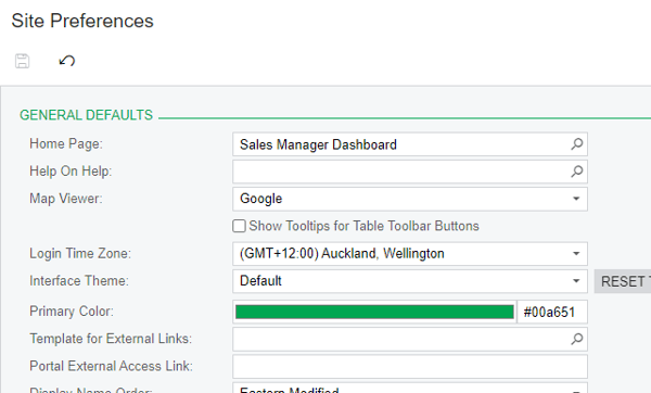 Alternatively, MYOB Acumatica provides an easy way to modify the main color associated with your site. Go to the site preferences screen in your main application (not the portal) and change the standard colour to a different colour… such as #00a651 to get the result below.