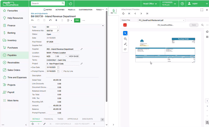 The MYOB Acumatica PDF Annotator brings advanced PDF viewing and annotation capabilities directly inside your MYOB Acumatica environment. Seamlessly integrated into the document management system, it adds a side panel to any record that has attached files. Whether you’re working with bills, contracts, or other documents, you can view and annotate PDFs without ever leaving the platform.