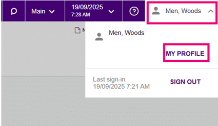 Step 1: Access My Profile. Select your username at the top-right of the screen and click My Profile.